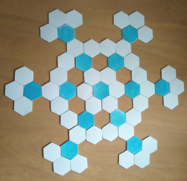 Le flocon obtenu à l’étape 6 est représenté sur la photo ci-dessus. Les hexagones coloriés lors des étapes 1, 3 et 5 sont bleus. Les hexagones coloriés lors des étapes 2, 4 et 6 sont blancs.