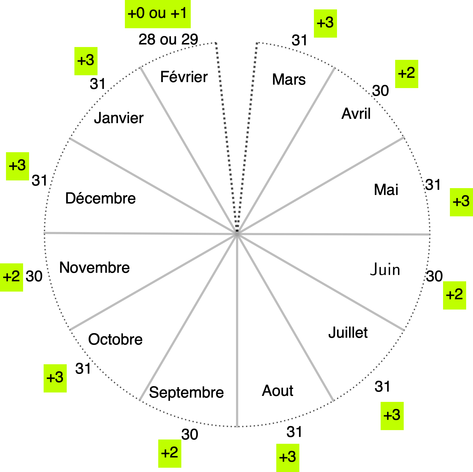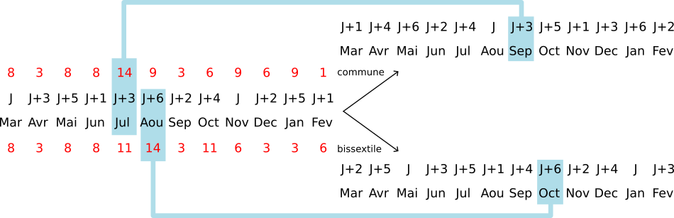 Ci-après, nous avons répertorié le nombre de jours de mois sur une durée d’un an en commençant par le mois de mars ainsi qu'en vert le décalage du code du mois par rapport au suivant. En procédant ainsi, le dernier jour de l’année-décalée (une décannée) est le 28 ou le 29 février et une décannée comporte 365 ou 366 jours. L’avantage est qu’en considérant une décannée, les décalages cumulés d’un jour de semaine d’un mois à un autre sont toujours les mêmes, que l’année soit bissextile ou non. Le décalage entre le dernier mois de la décannée A et le premier mois de la décannée A+1 dépend du caractère bissextile de l'année A.