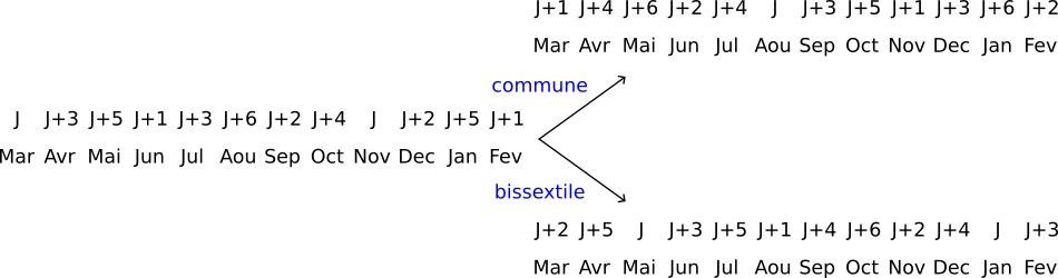 Quand au mois de mars de la décannée suivante A+1, son code est J+2 si A est bissextile, et J+1 sinon. Regardons ce qui se passe sur deux décannées successives.
