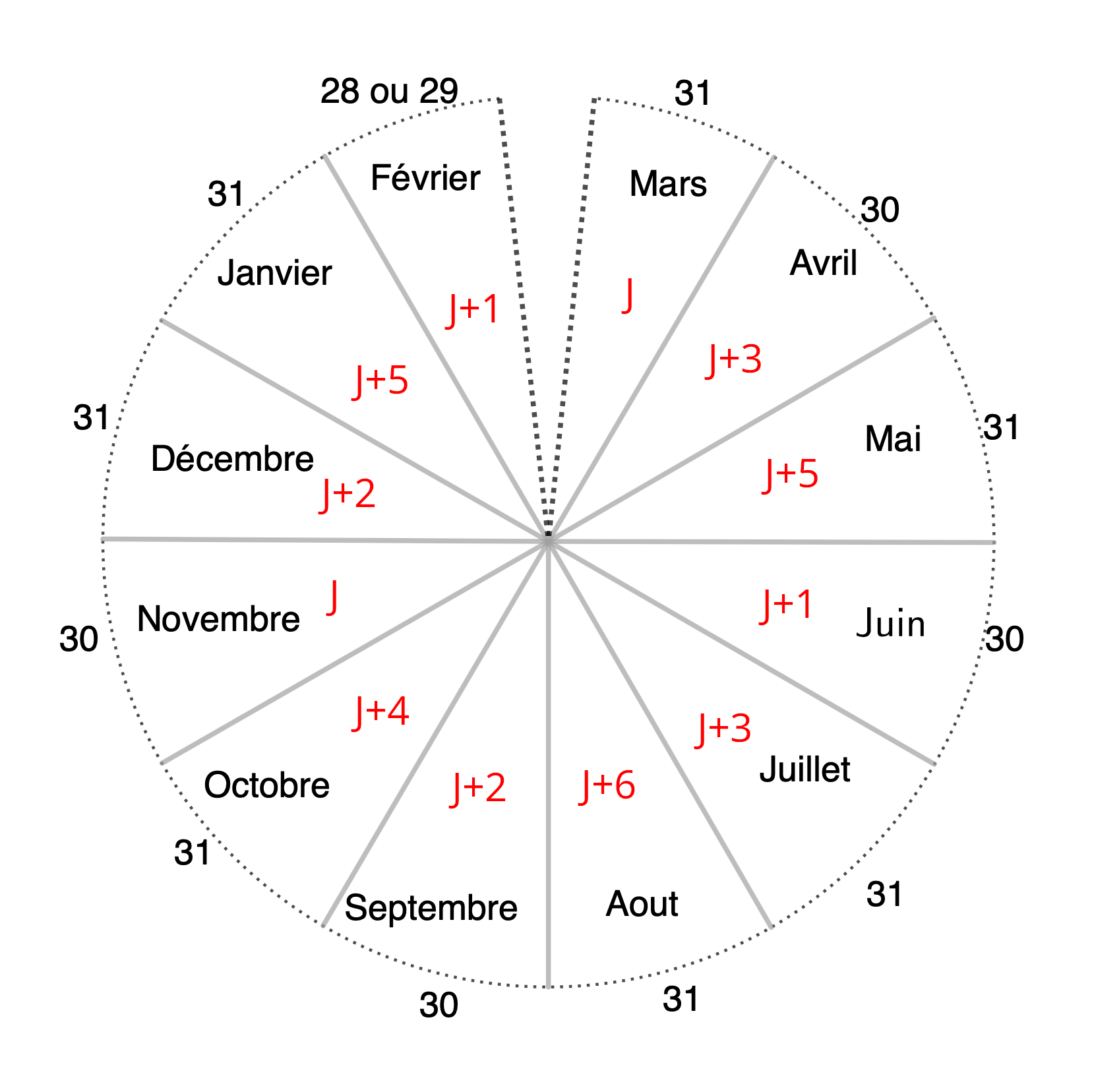 En cumulant ces décalages, on obtient les codes des mois d'une décannée en fonction des code J de son premier mois (le mois de mars, donc).