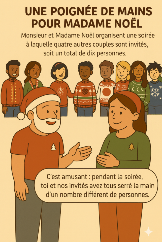 Au moment de ranger après la fête, Monsieur Noël dit à son épouse : « C’est amusant : pendant la soirée, toi et nos invités avez tous serré la main d’un nombre différent de personnes. »