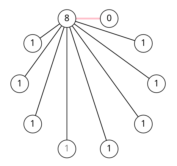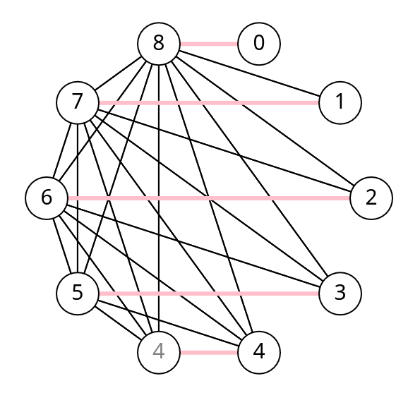 Une personne peut au maximum avoir serré la main de toutes les personnes hors son(-sa) propre partenaire. Elle a donc au plus \(2n-2\) poignées de main possibles. Ainsi, les \(2n-1\) valeurs différentes observées parmi les autres personnes sont nécessairement : \[ 0, 1, \ldots, 2n-2. \] De plus, celui qui n’a serré aucune main (valeur \(0\)) doit être le partenaire de celui qui a serré toutes les mains sauf celle de son partenaire (valeur \(2n-2\)). En effet, sinon la personne de valeur \(0\) lui aurait serré la main. On sait donc qu’il existe un couple ayant les valeurs de poignées (\(0, 2n-2\)) et qui ne contient pas l'observateur. On va faire une récurrence sur le nombre de couples. On va noter \(O\) l'observateur et \(A_0\), \(A_1\), \(\ldots\), \(A_{2n-1}\) les autres, indexées en fonction du nombre de mains serrées.Initialisation (cas \(n = 2\))