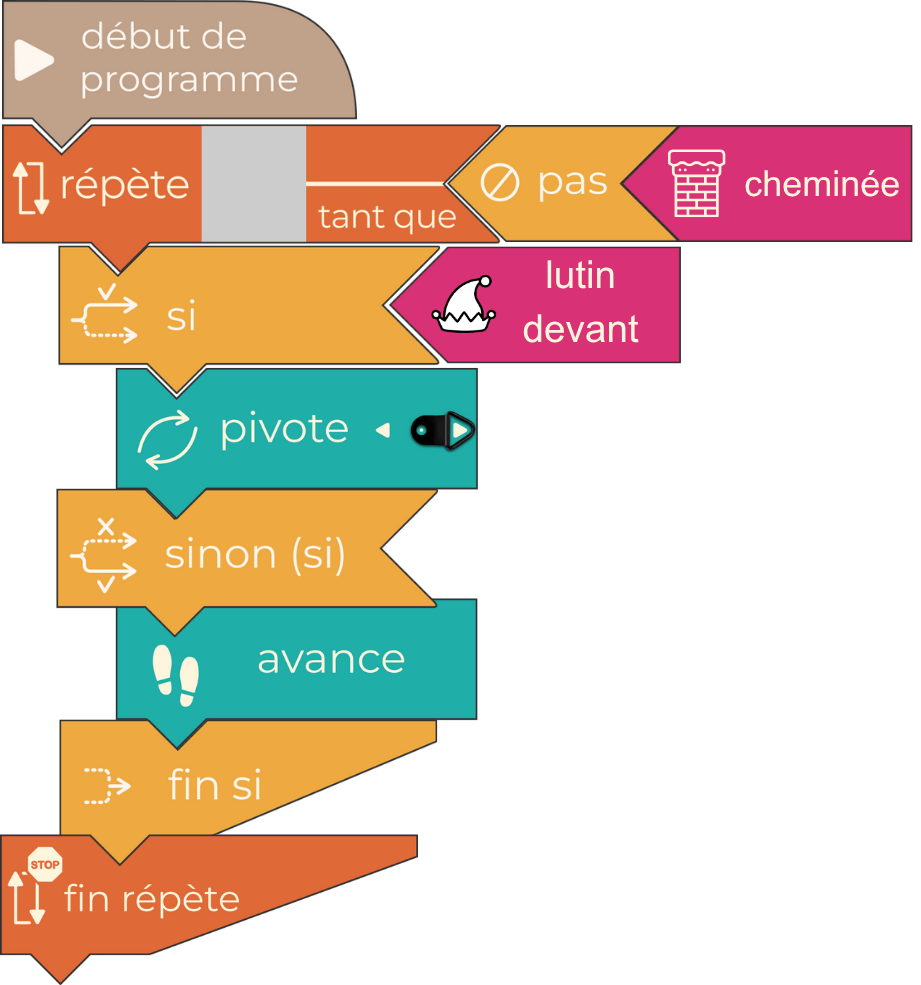 Le programme correct utilise une répétition conditionnelle tant que pour réaliser un ensemble d’actions tant qu’on n'a pas détecté la cheminée. Il faut bien entendu commencer par début de programme. Dans notre boucle, on a une logique conditionnelle : si on rencontre un lutin devant nous, on va simplement pivoter vers la droite, et sinon on avance. Ne pas oublier de fermer la structure si avec un fin si, et la structure répète par un fin répète tout en bas !