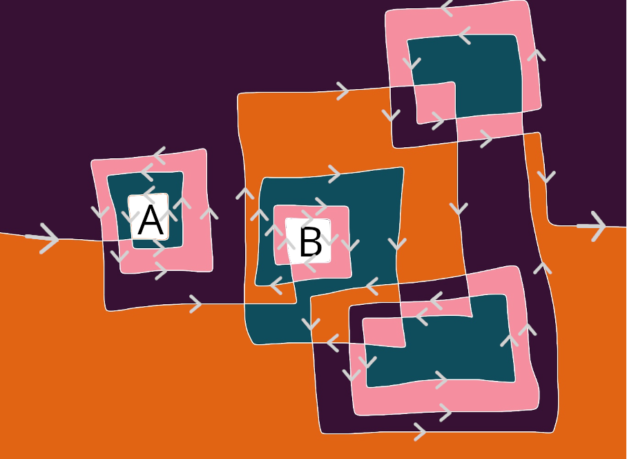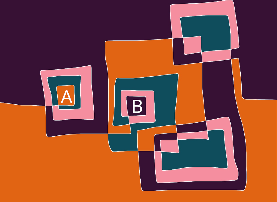 On remarquer d'abord que les zones d’une couleur donnée ne partagent un bout de courbe qu’avec des zones de deux autres couleurs différentes. Par exemple, pour le rose c’est le turquoise et le violet. Et pour le turquoise, c’est le rose et l’orange. Du coup, la zone A est forcément orange ou rose et la zone B violette ou turquoise.