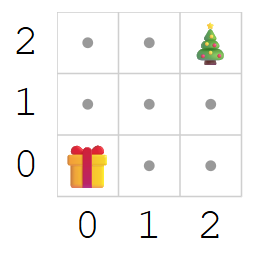 Dans l’atelier du Père Noël, un lutin malicieux a programmé un petit robot convoyeur autonome nommé Volta 🤖, pour transporter des cadeaux du coin inférieur gauche S(0,0) 🎁 jusqu’au coin supérieur droit F(2,2)🎄d’un atelier de 3×3 cases.