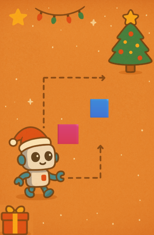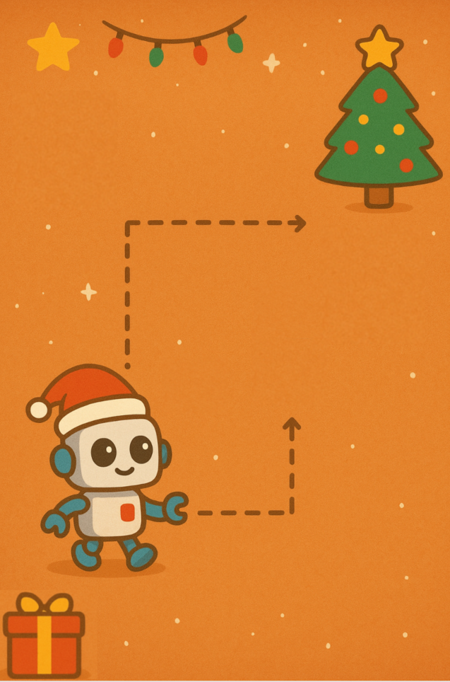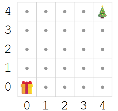 Dans l’atelier du Père Noël, un lutin malicieux a programmé un petit robot convoyeur autonome nommé Volta 🤖, pour transporter des cadeaux du coin inférieur gauche S(0,0) 🎁 jusqu’au coin supérieur droit F(4,4)🎄d’un atelier de 5×5 cases.