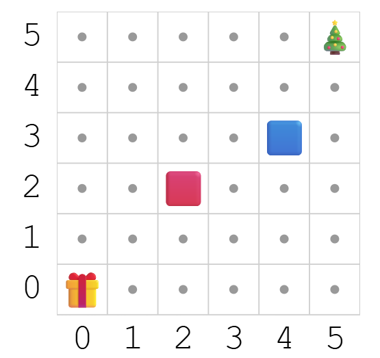 Dans l’atelier du Père Noël, un lutin malicieux a programmé un petit robot convoyeur autonome nommé Volta 🤖, pour transporter des cadeaux du coin inférieur gauche S(0,0) 🎁 jusqu’au coin supérieur droit F(5,5)🎄d’un atelier de 6×6 cases.