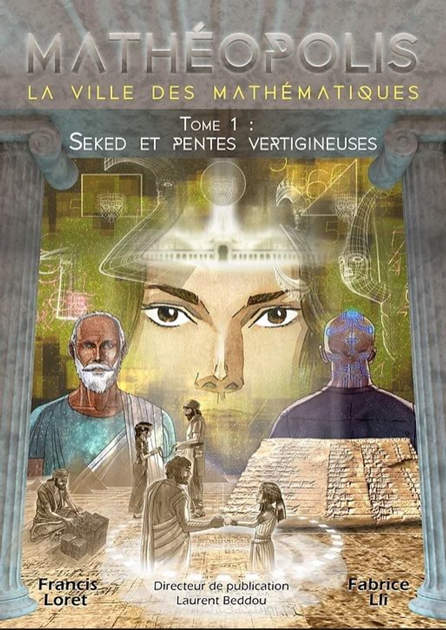 Trois ans après la sortie du Tome 0, nous sommes heureux de pouvoir vous annoncer que la collection Mathéopolis s’enrichit d’un 2ème Tome : « Seked et pentes vertigineuses ». Plus dense que le précédent avec 54 pages supplémentaires, ce nouveau volume conserve le format de roman illustré, tout en proposant une intrigue de plus en plus riche et approfondie. Le Tome 1 est conçu pour offrir une découverte des mathématiques mésopotamiennes (numération, calcul des pentes, éléments de trigonométrie), ainsi que des mathématiques égyptiennes et grecques (théorèmes de Thalès et de Pythagore) à travers l’étude de la notion transversale de pente (seked).
