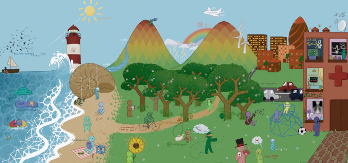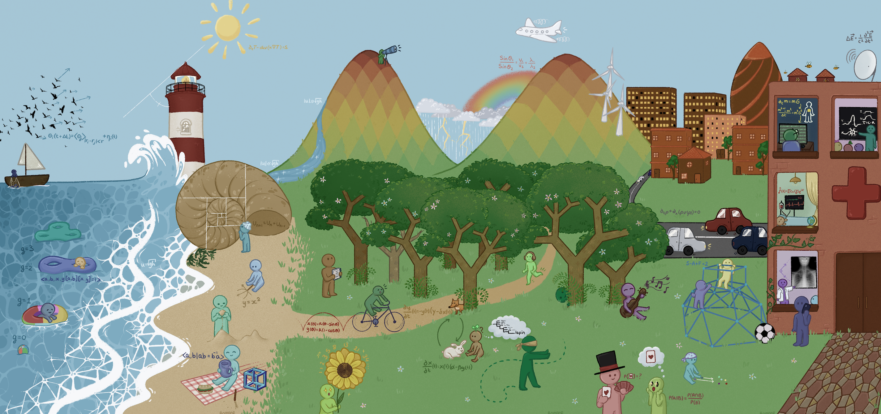 Description extraite du site Kits Maths :Cette illustration éclaire la diversité des mathématiques, et leurs liens avec notre environnement. L'esthétique enfantine de l'image, similaire à un jeu de cherche et trouve, est un choix délibéré pour attirer l'attention d'un large public.